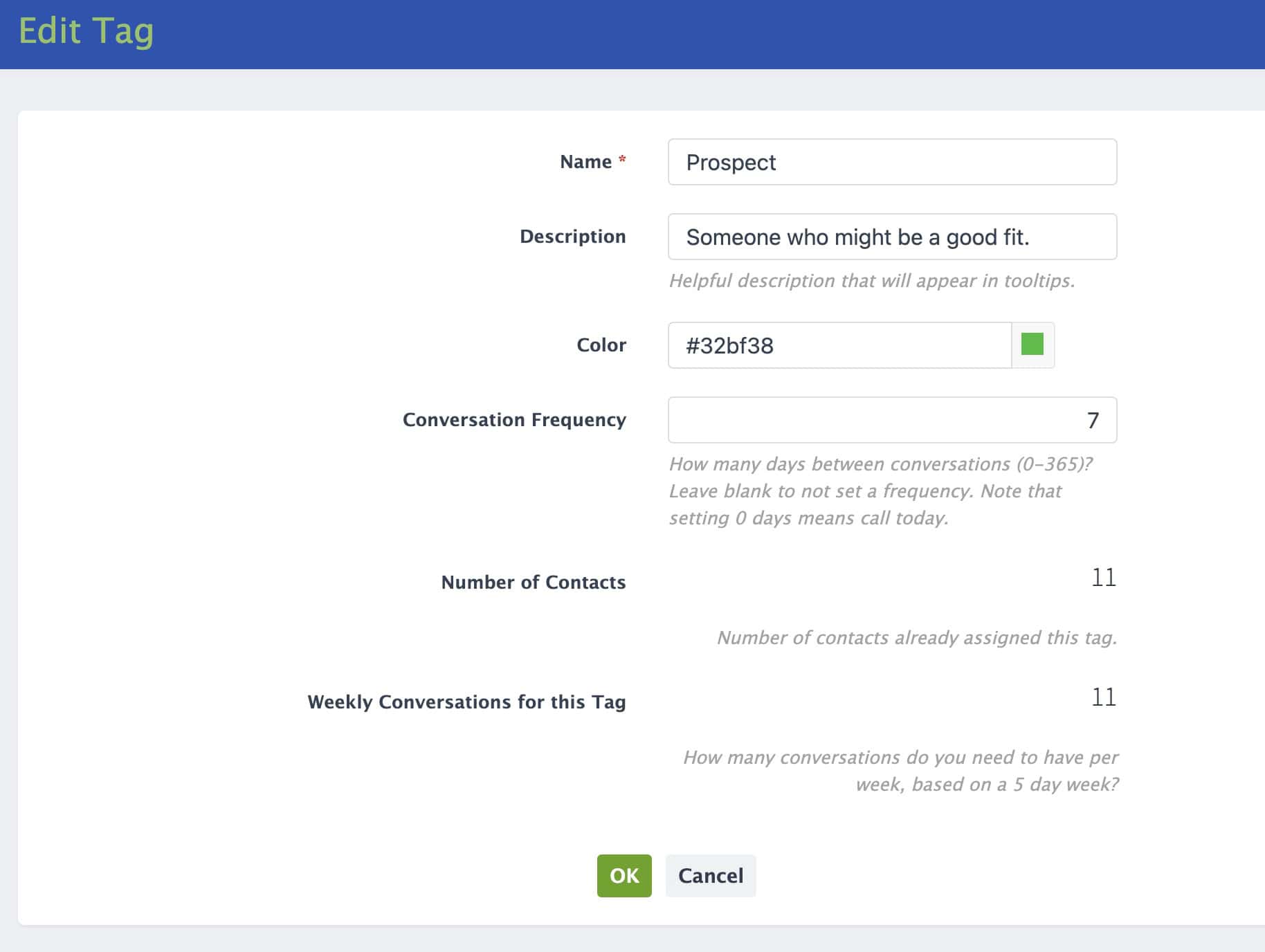 When you define a default conversation interval for a Tag (“I want to talk to prospects every 7 days”, “I want to talk to partners every 60 days”, etc), Mimiran will show you how many conversations you need to have each week to keep up with your audience. For example, if you have 11 Prospects, and you want to talk to them every week, you naturally need to be having 11 prospect conversations each week to keep up.